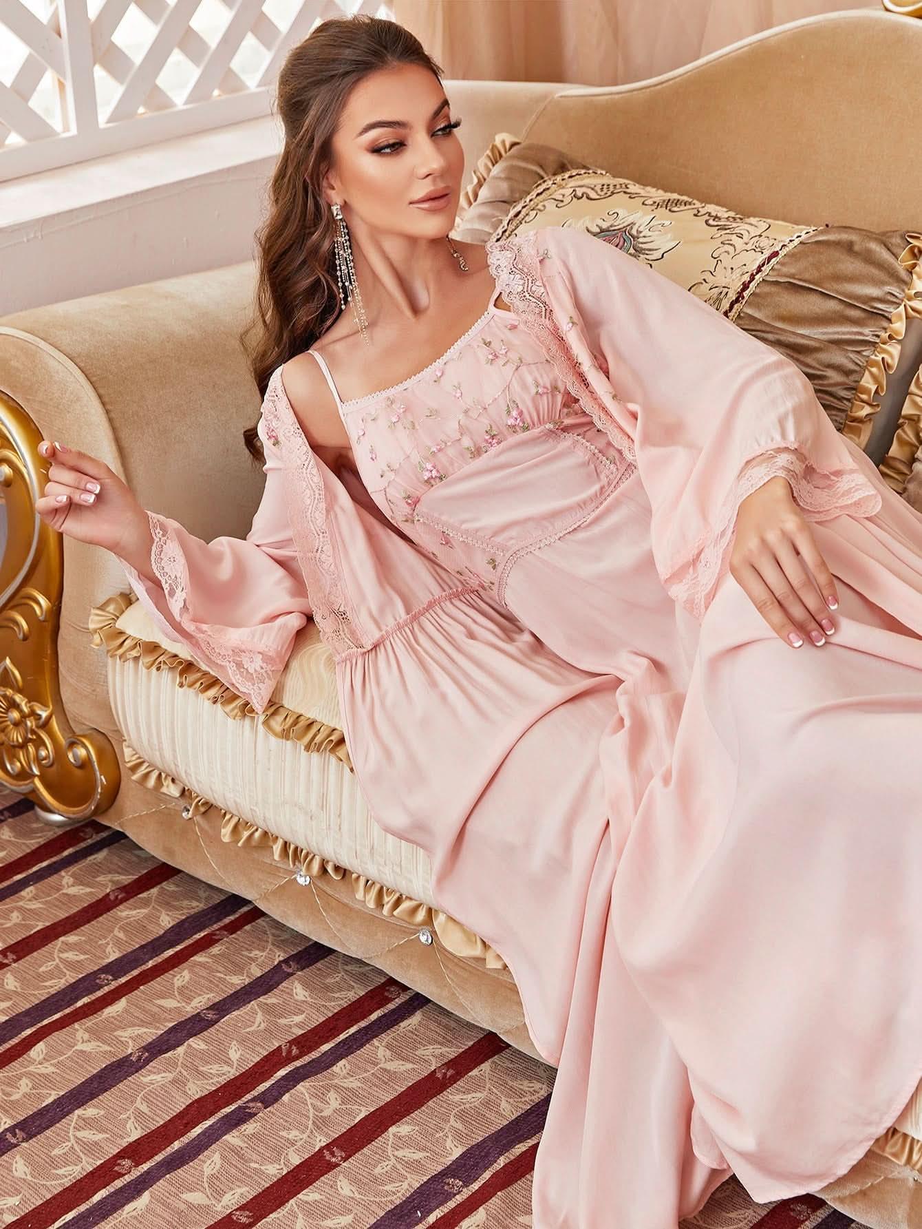 طقم بيجامة مكون من رداء شبكي مطرز بأزرار للنساء