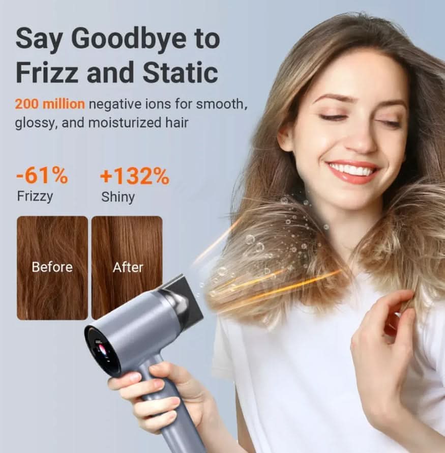 مجفف الشعر الأيوني السلبي: يقلل من التجعد والكهرباء الساكنة بنسبة 61% عن طريق تحييد الأيونات الموجبة، ويزيد من اللمعان بنسبة 132% عن طريق حبس الرطوبة في الشعر باستخدام 200 مليون أيون سالب