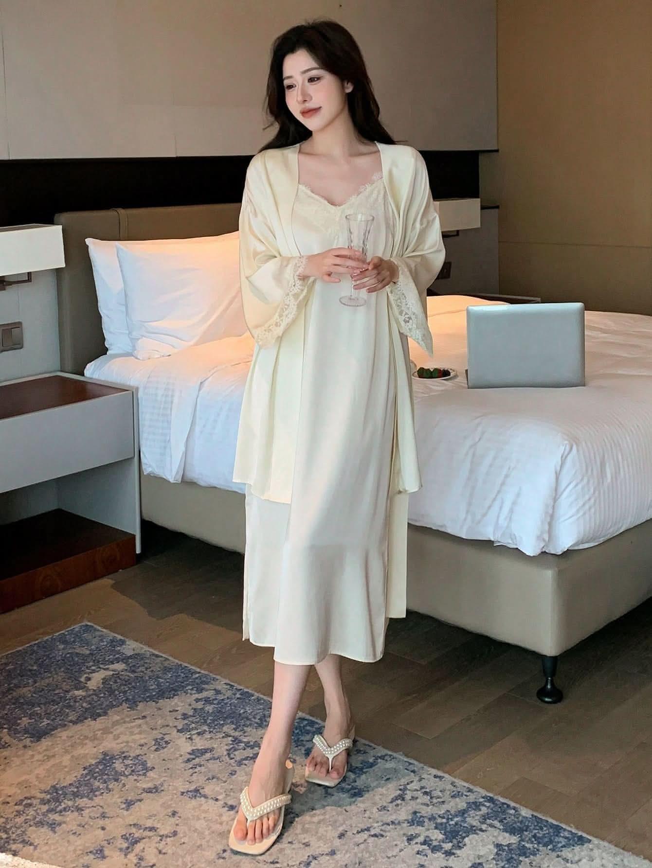 طقم بيجامة من الساتان مع رداء بتفاصيل من الدانتيل للنساء
