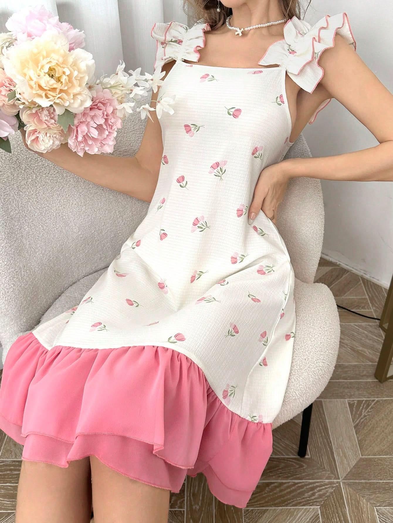فستان نوم برباط عريض ورفرف، ملابس داخلية نسائية صغيرة مزينة بالزهور