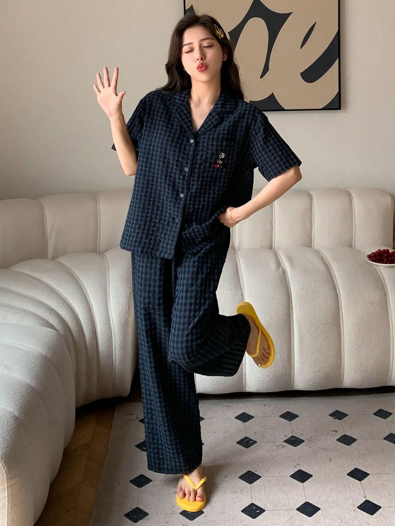 طقم بيجامة مخطط مطرز بأكمام قصيرة مع بنطلون طويل بأزرار أمامية من الملابس الداخلية النسائية