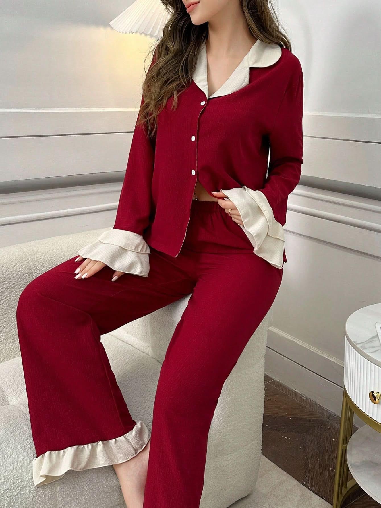 بدلة نوم نسائية بأزرار وياقة مكشكشة بلون متباين - ملابس داخلية نسائية