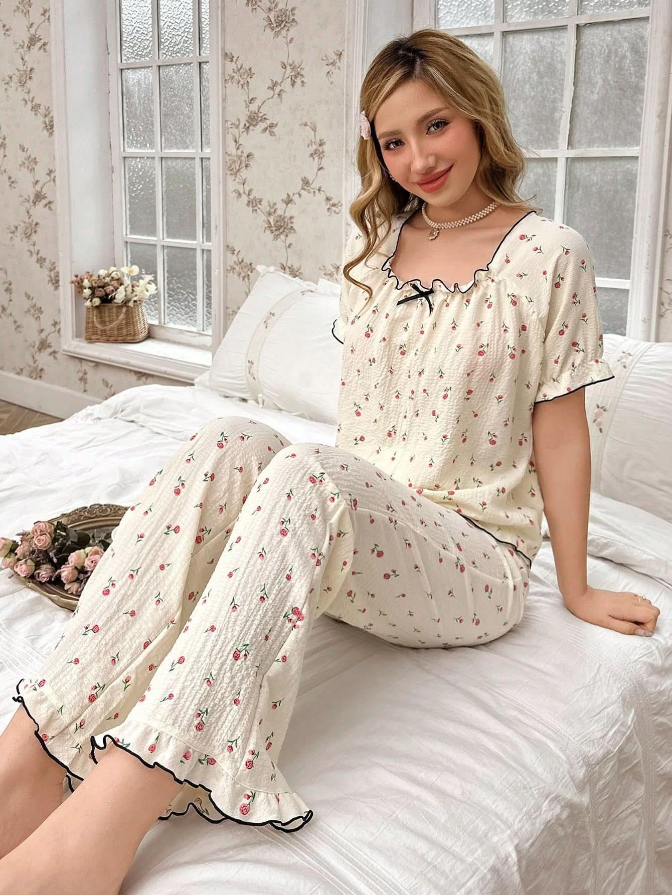 طقم بيجامة نسائية بطبعة زهور حمراء بطبعة فقاعات من الملابس الداخلية النسائية