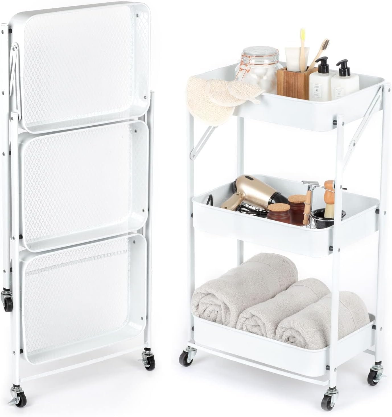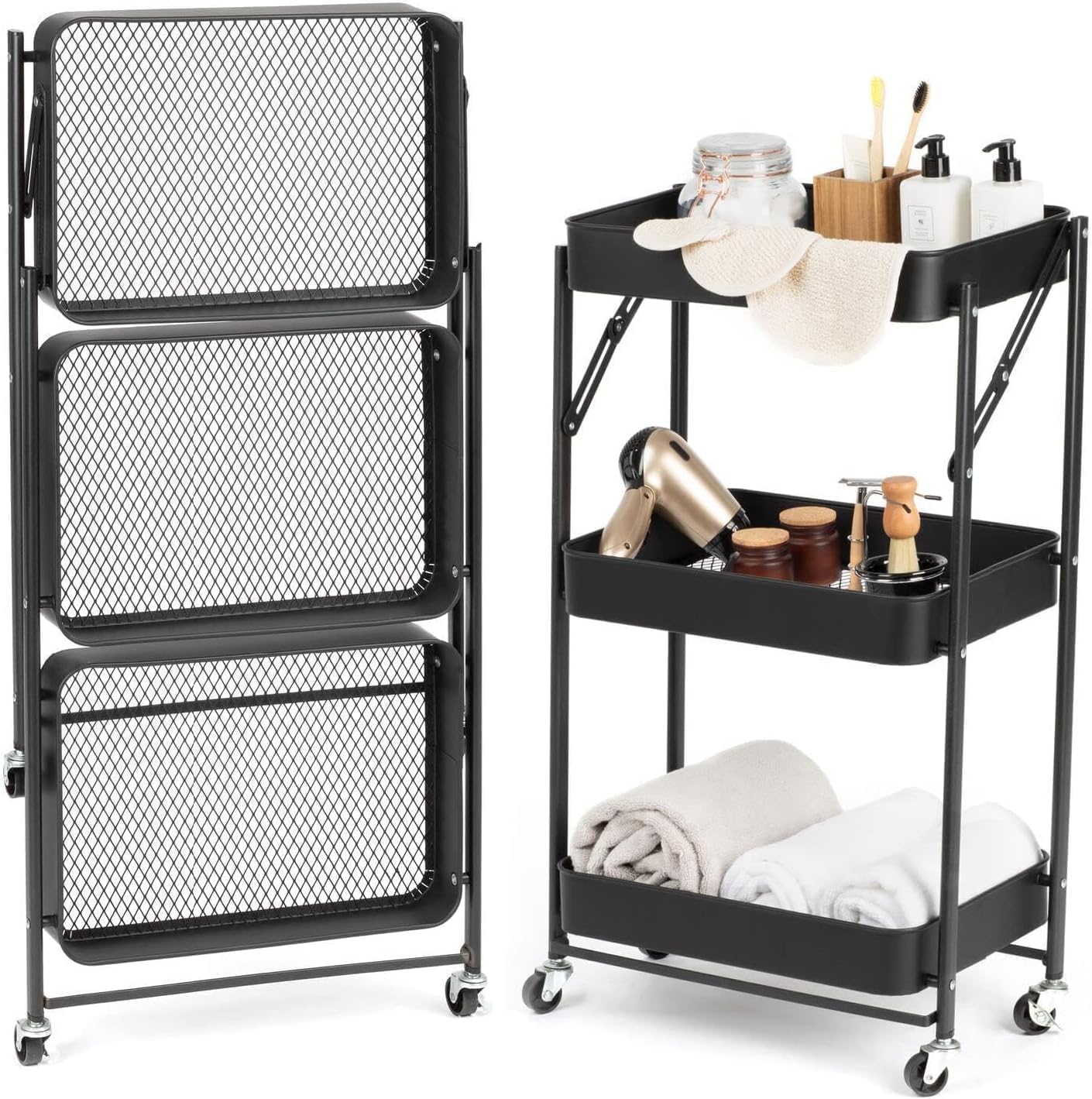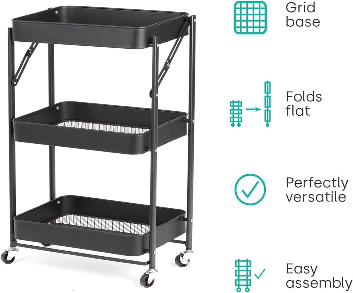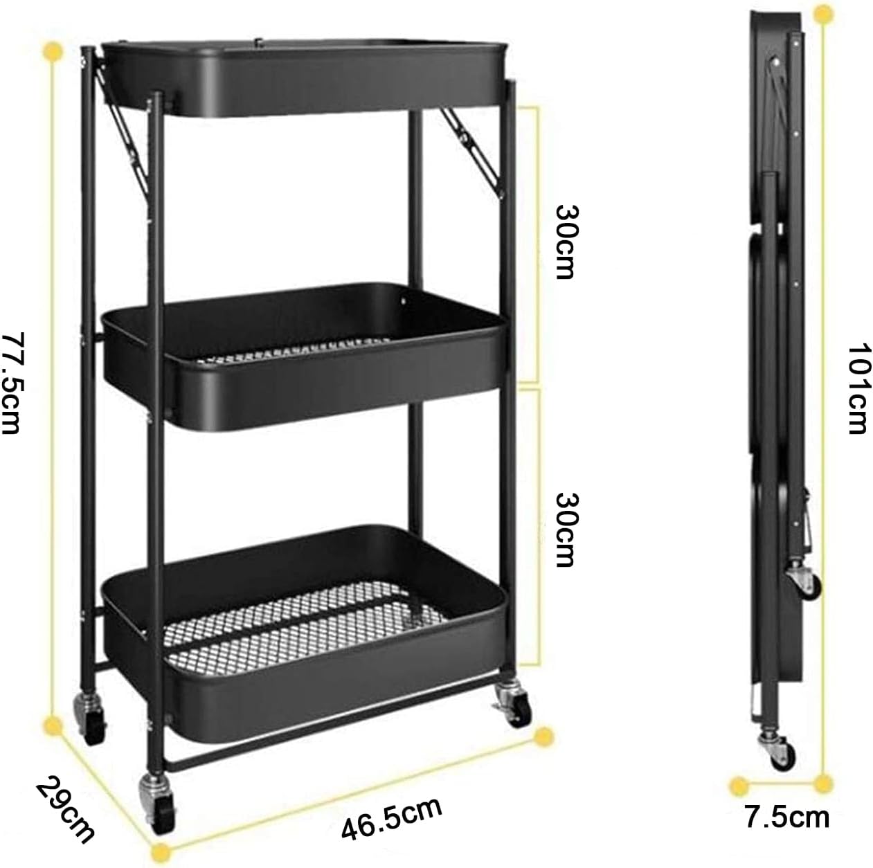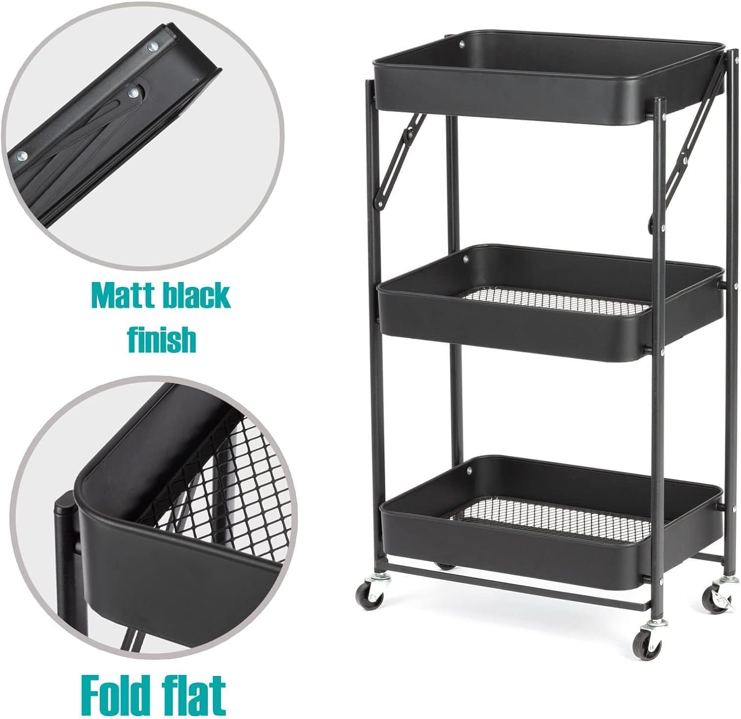 3 Tiers Foldable Storage Trolley Cart Kitchen utility carts Foldable Rolling Carts Trolley with Locking Wheels for Kitchen Multi-purpose Shelving Organizer (black)