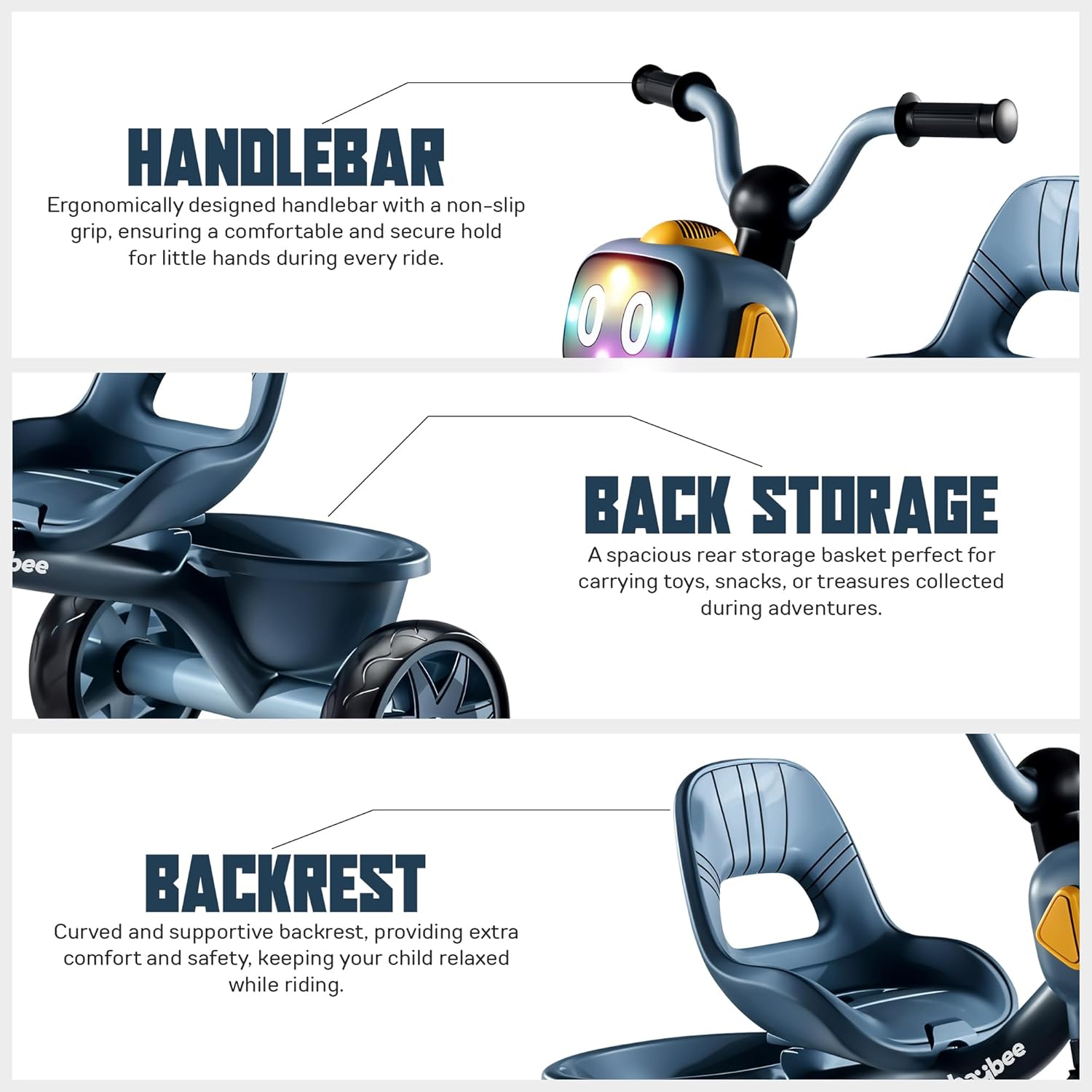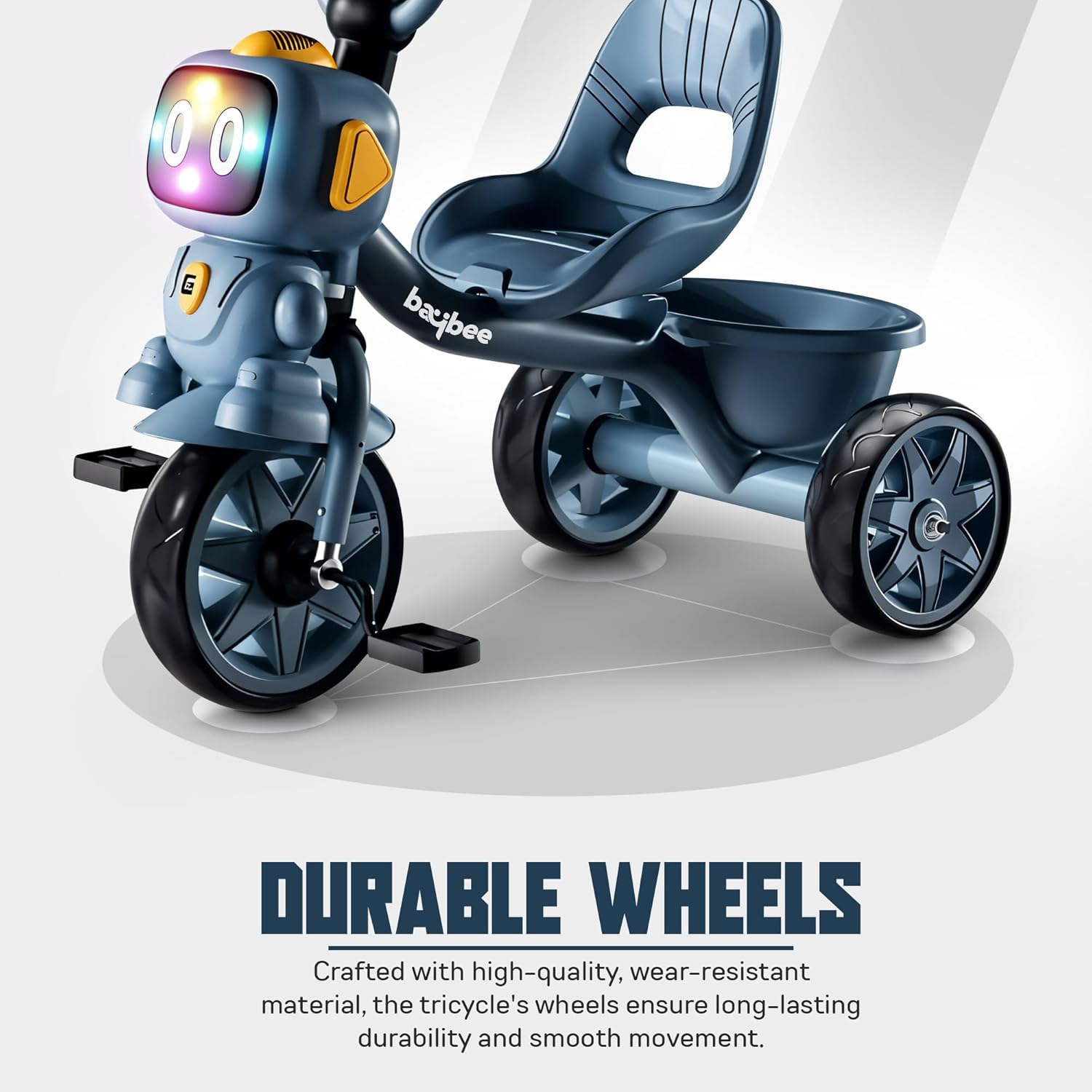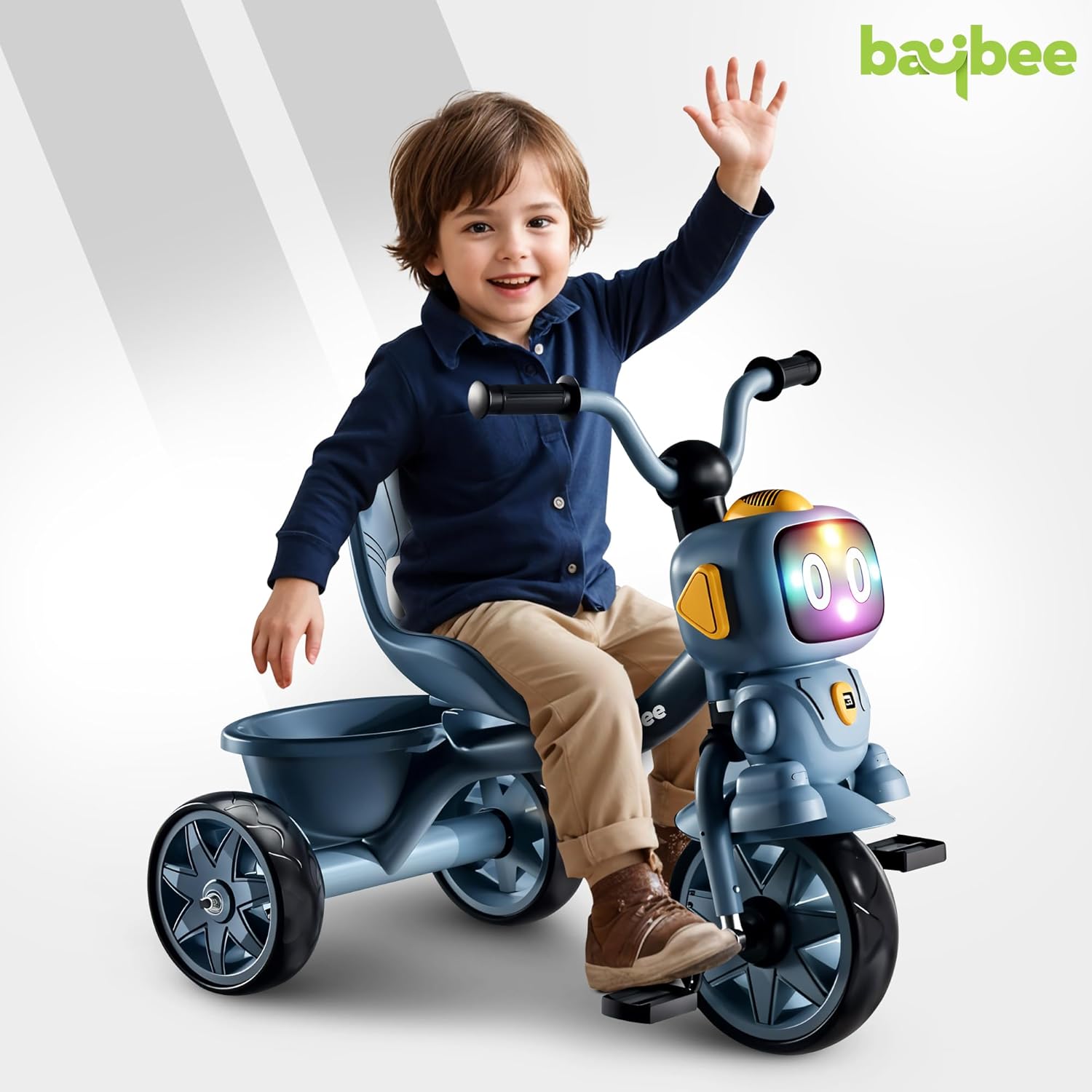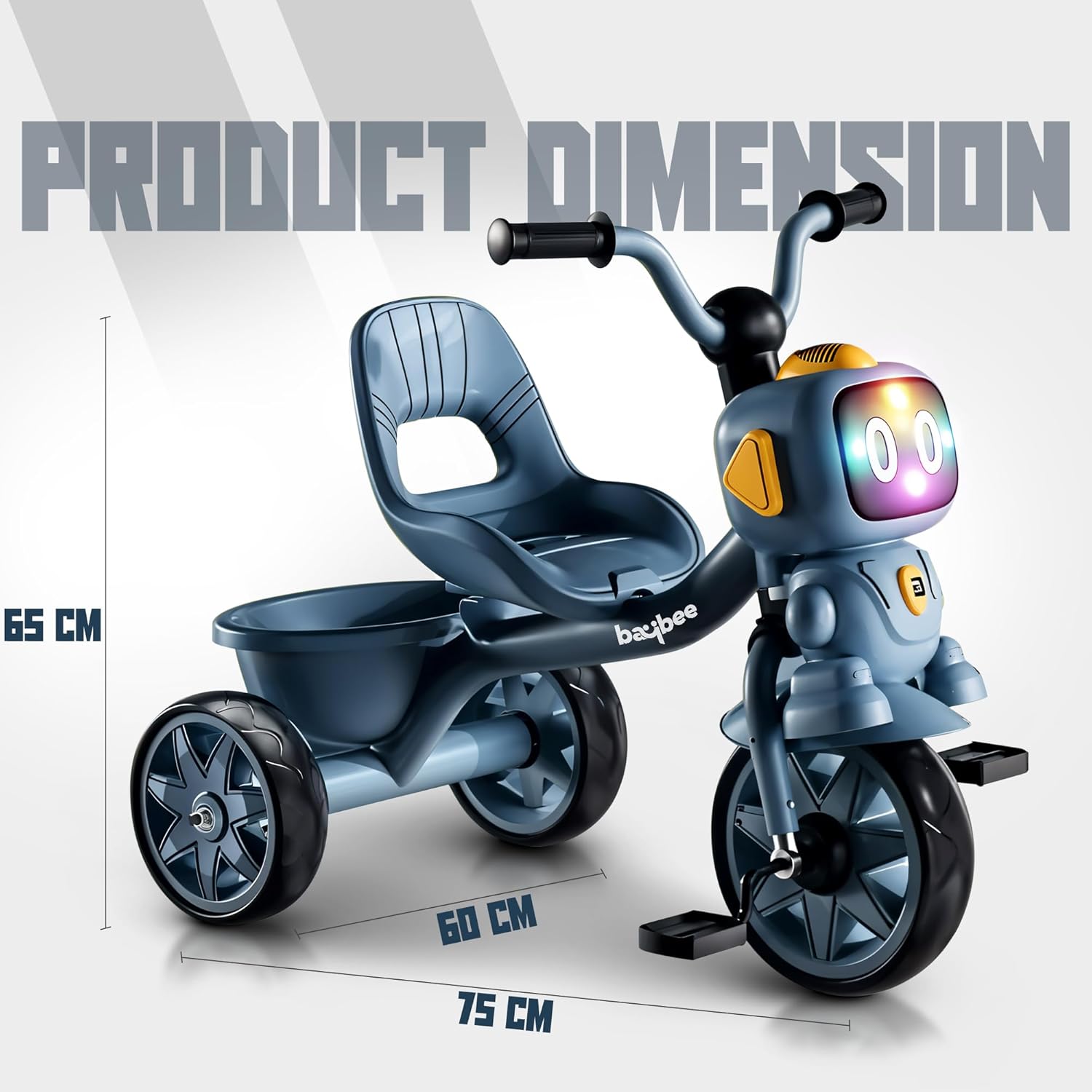 The Baybee Robo Baby Tricycle combines fun, safety, and practicality in a unique design. Featuring an eye-catching robot head, it sparks imagination and engages kids during every ride. Equipped with interactive music and vibrant lights, it offers an entertaining experience that stimulates the senses. A convenient rear storage basket allows children to carry their toys, snacks, or other small essentials, while the comfortable high backrest provides extra support for a secure ride. Built with durability in mind, this tricycle ensures a long-lasting and safe experience for toddlers, making it the perfect choice for outdoor adventures.