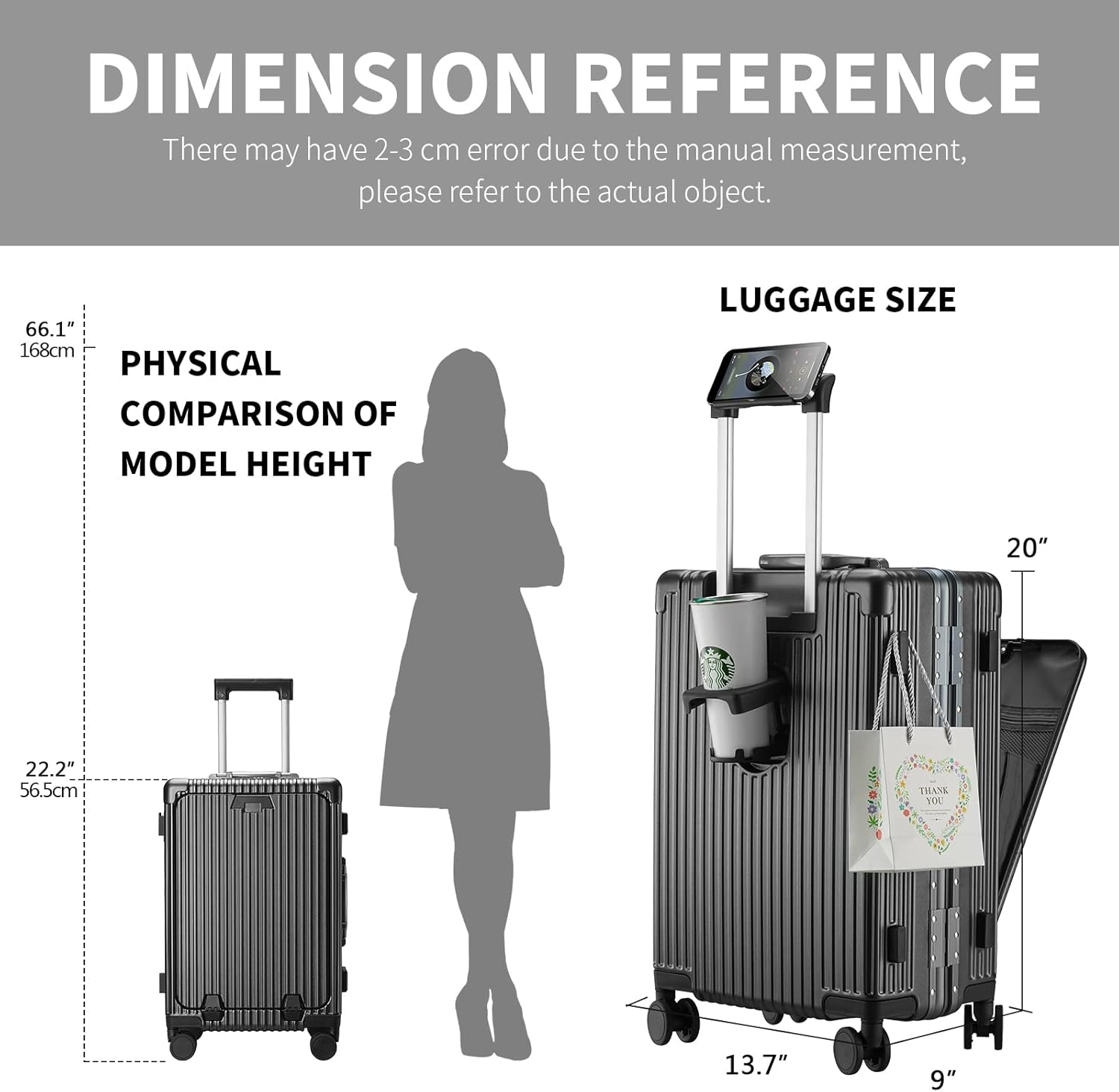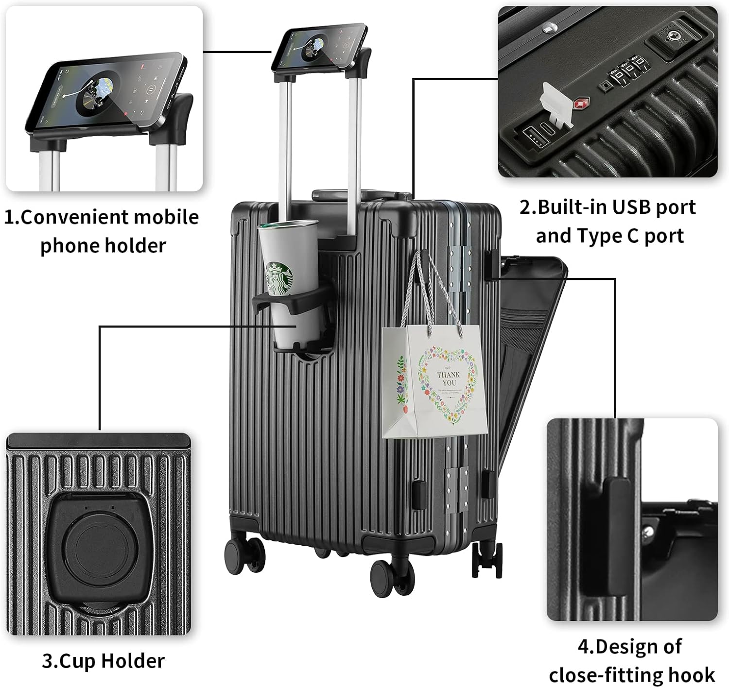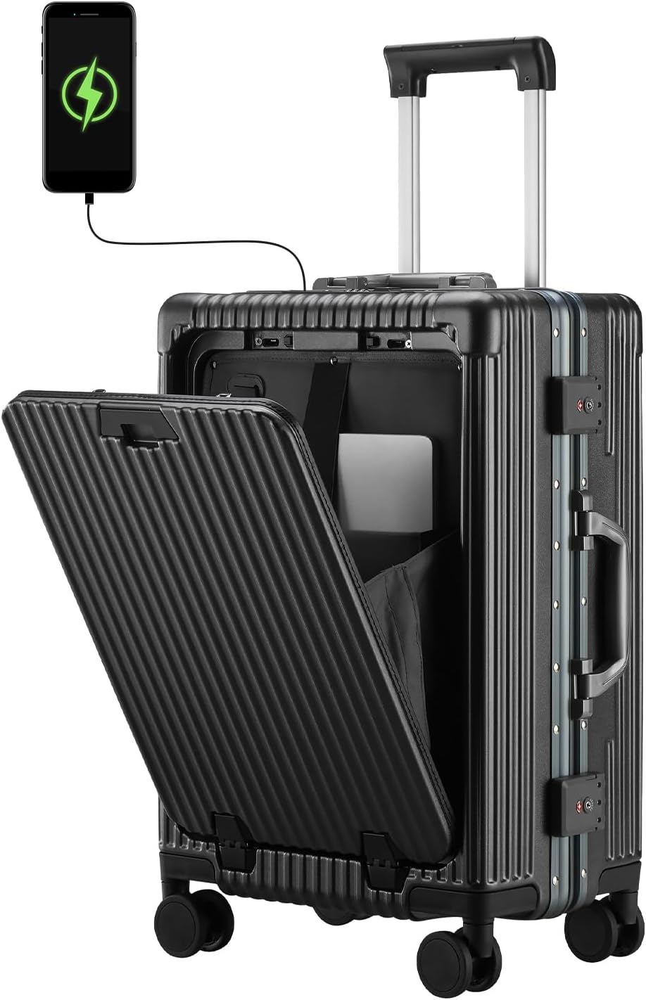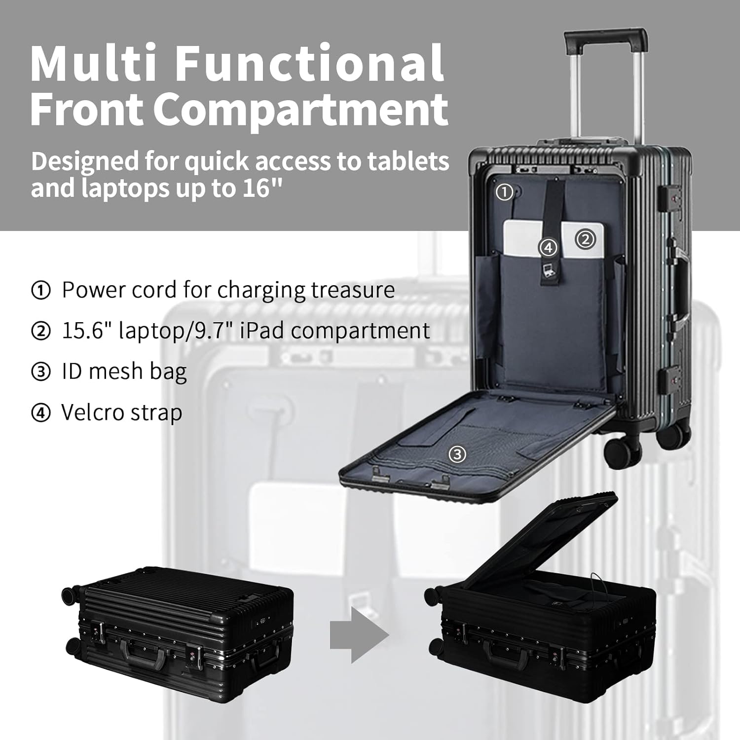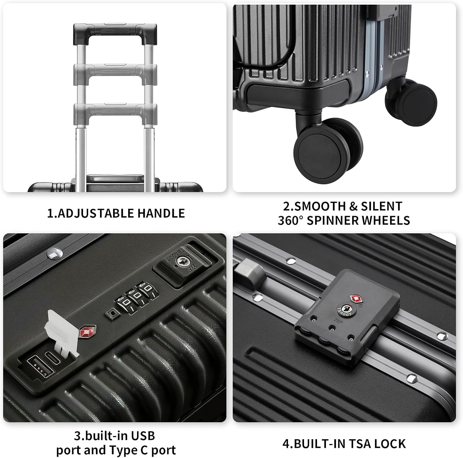 This aluminum suitcase marries the best of timeless chic with modern innovation. Its durable aluminum shell and TSA-approved lock keep your valuables secure and protected.The bag is designed to fit in overhead luggage on "almost any flight, anywhere in the world"Durable Aluminum Frame: The luggage's robust aluminum frame offers exceptional strength and resilience, protecting your belongings against impacts and rough handling.Built to Last - Our luggage is made of extra-thick PC+ABS material for a hardshell that's impact-resistant, lightweight, and durable.black white luggage white black suitcaseMeasuring 22.0x14.0x9.0, this luggage is perfect for storing a 15.6" tablet/laptop.Spinner luggage, which features four wheels that can spin 360 degrees, are easy to maneuver whether you're running to your airport gate or making your way through a new city. They're generally quite easy to roll over various surfaces, making them a great option if you plan to walk for long periods of time with your luggage.Our selection of premium aluminum frame luggage is designed to provide durability, style and convenience for all your travel adventures.With their sleek design and advanced features, these versatile travel companions are a must-have for frequent flyers, globetrotters, and weekend warriors alike.The carry-on features extra organization to make packing and accessing your belongings easier. Includes a laptop sleeve, a shoe divider, a laundry bag, various zippered sections, exterior pockets, and a USB port with power bank pocket.We replaced the outside zippers with an aluminum frame and three integrated hasp locks. Sets a different combination code on each TSA-approved hasp lockThis is a 20-inch suitcase, which meets the airline's standard for taking it on the plane, and you can take it on the plane without checking it.Telescopic Handle: The ergonomic design ensures a comfortable grip, facilitating smooth navigation through busy terminals.