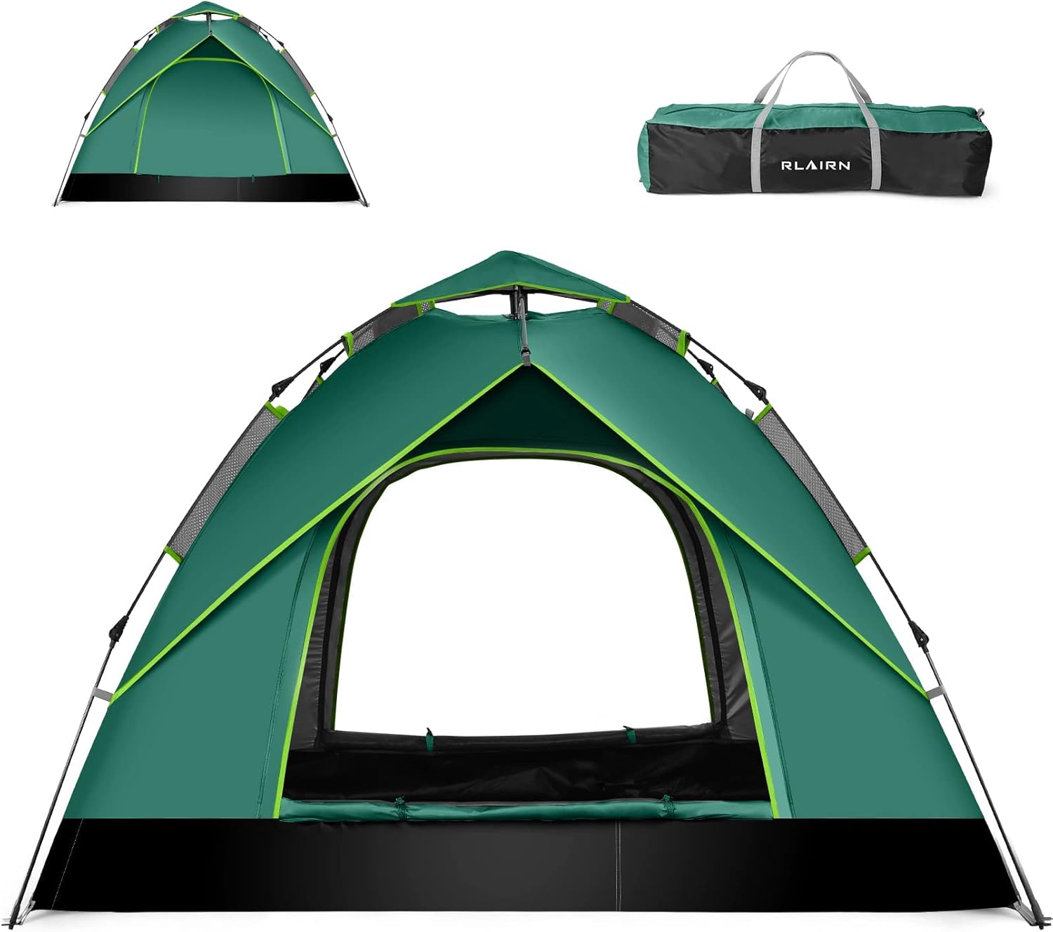 BZTANG pop-up camping tent Space for 3-4 people: Spacious space is best for camping with friends and family. More durable: upgraded materials can better cope with weather changes. Portable: A light tent can arouse your interest in camping at any time. Ventilation: Let you stay in the nature and enjoy the scenery in the tent. Detail Brand: RLAIRN Waterproof: 2000mm Fabric Material: 210T silver coated PU + 210D oxford Tent Pole: Foldable Pegs: Iron Bracket: Automatic Spring Lever Zippers: Portable dual zipper Sport Type: Camping & Hiking, Mountaineering, traveling Camping tent size Unfolding size: 210*190*145cm /82*74*55in Carry bag size:78*15*16cm /28*5.9*6.3inch Weight: 3kg/6.6lbs Capacity: 3-4 Person Center Height : 57.1inches Color: Deep Forest/ Light Green/Blue Package Includes: Tent x1 Instruction x1 Carry Bag x1 Pegs x 8 Windproof Ropes x4
