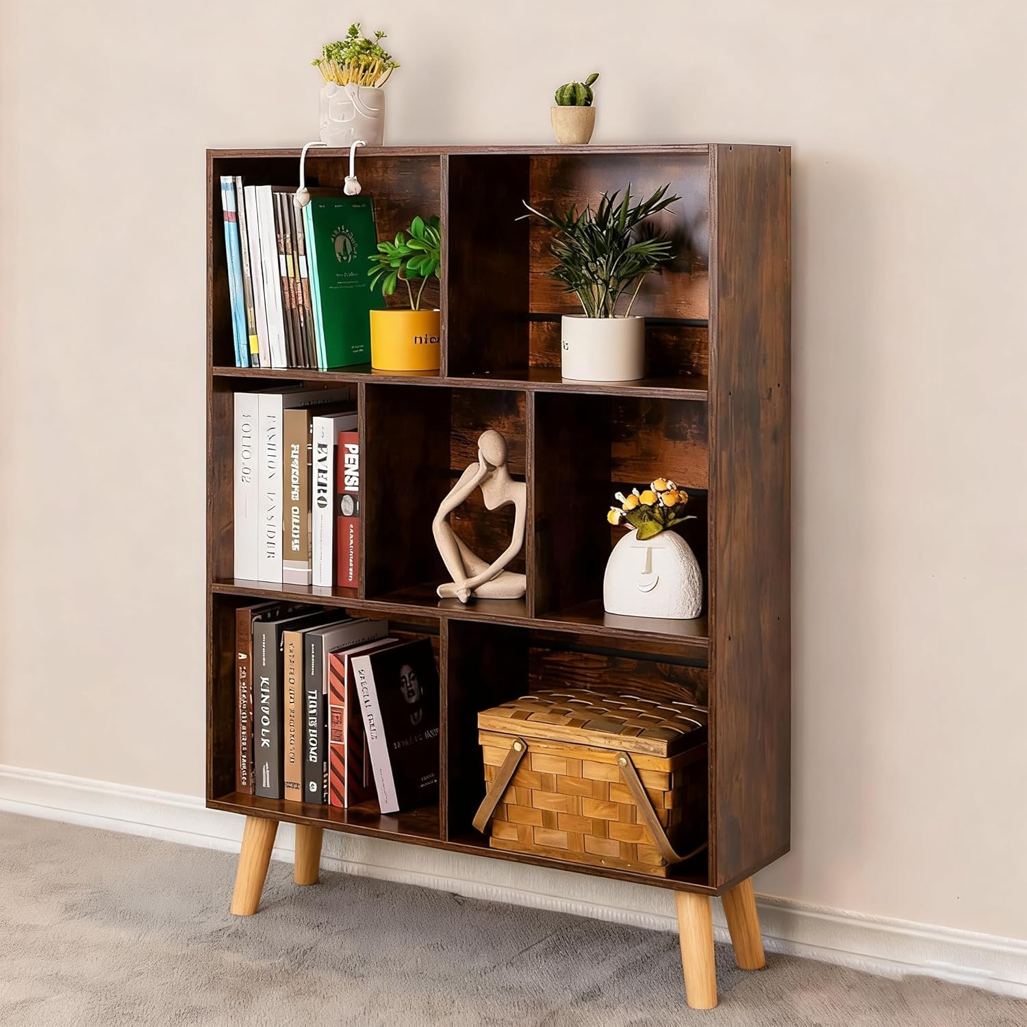 This bookcase is designed to offer multiple placement options, serving as a tall shelving unit or a horizontal storage unit.