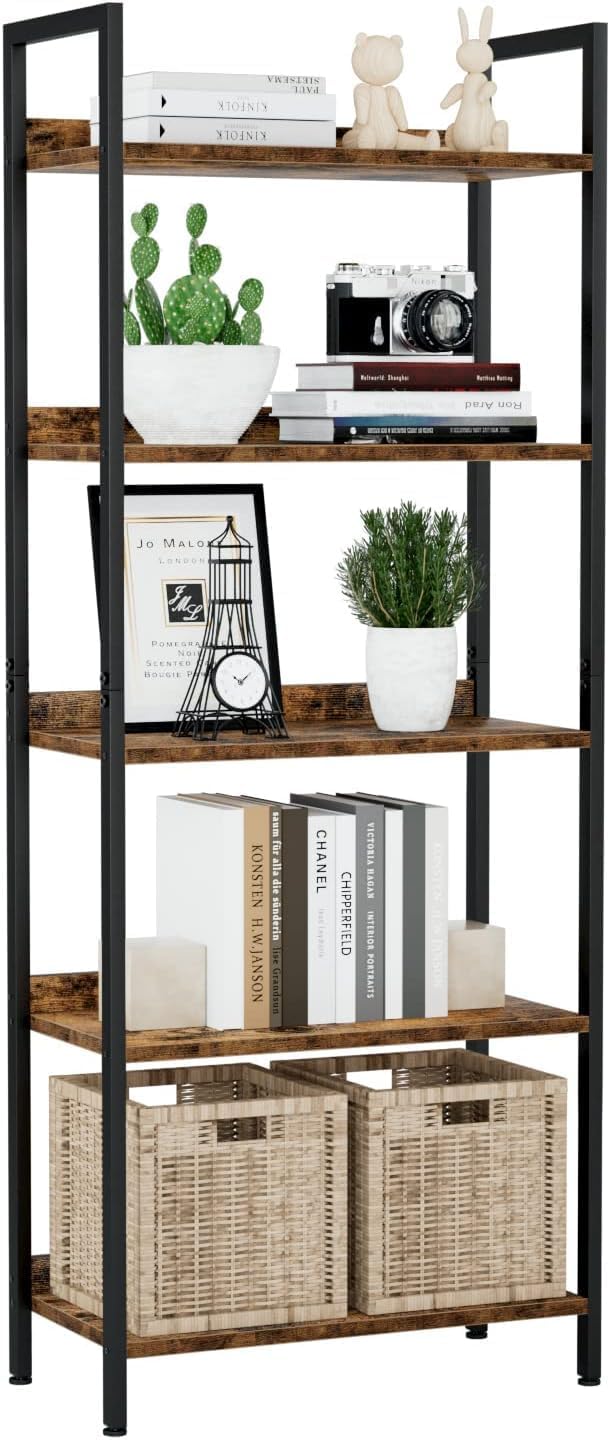 Chulovs Bookshelf, 5 Tier Bookshelves, Home Office Bookcase Shelf Storage Organizer, Free Standing Storage Shelving Unit for Bedroom, Metal Frame Display Rack for Living Room (Rustic Brown)