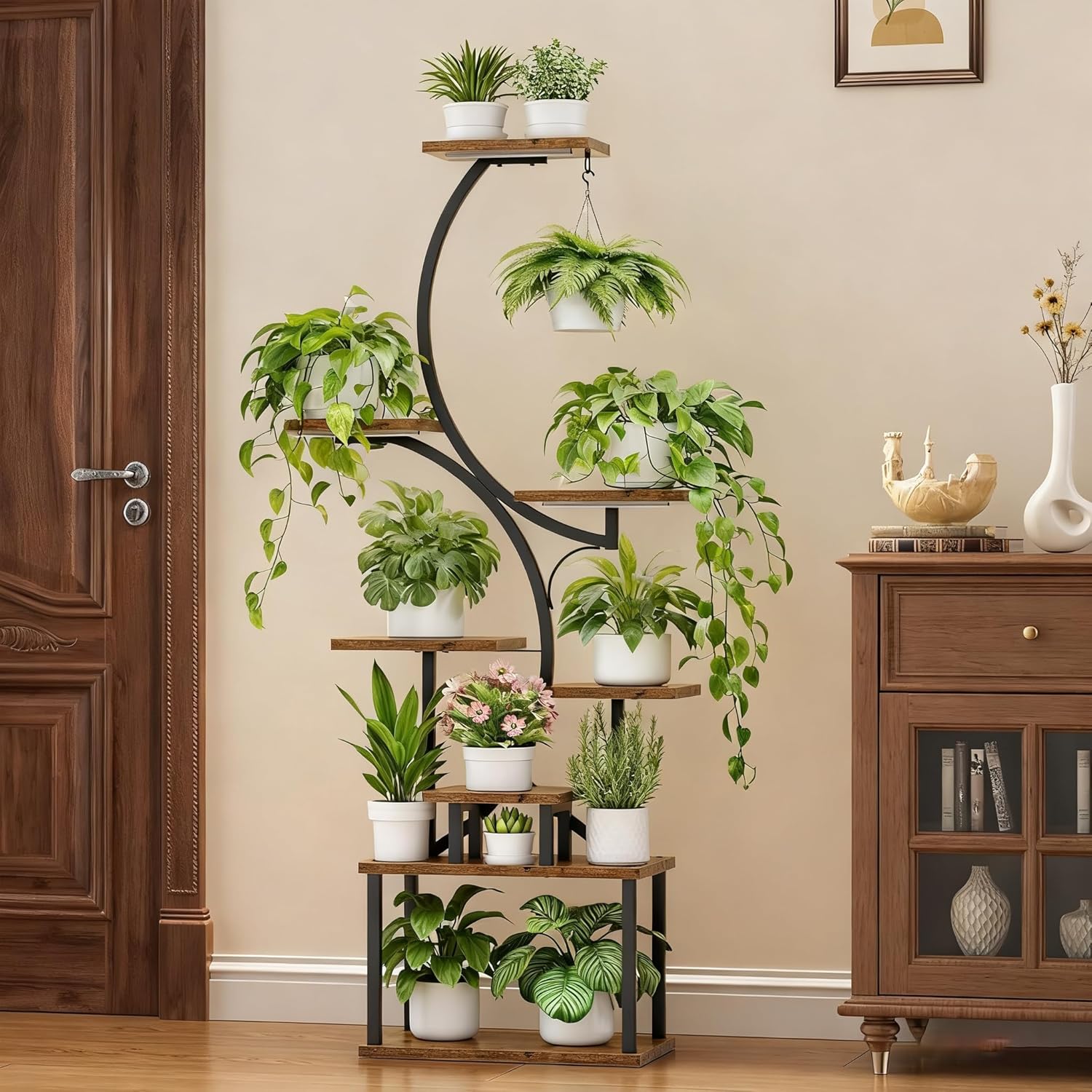 This S-shaped plant stand complements plants beautifully, its flowing curves mimicking natural growth patterns. It offers sturdy support while creating an eye-catching display that enhances the beauty of your greenery.
