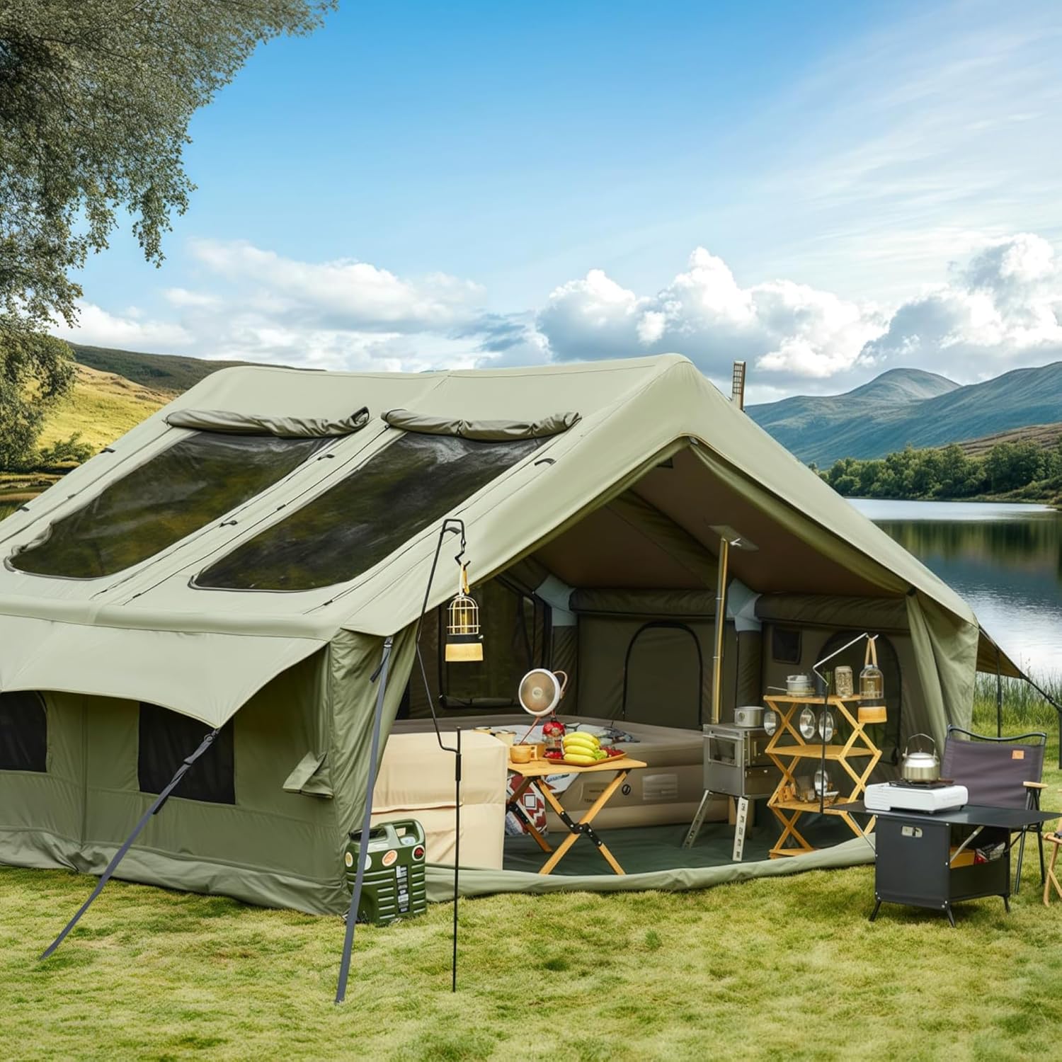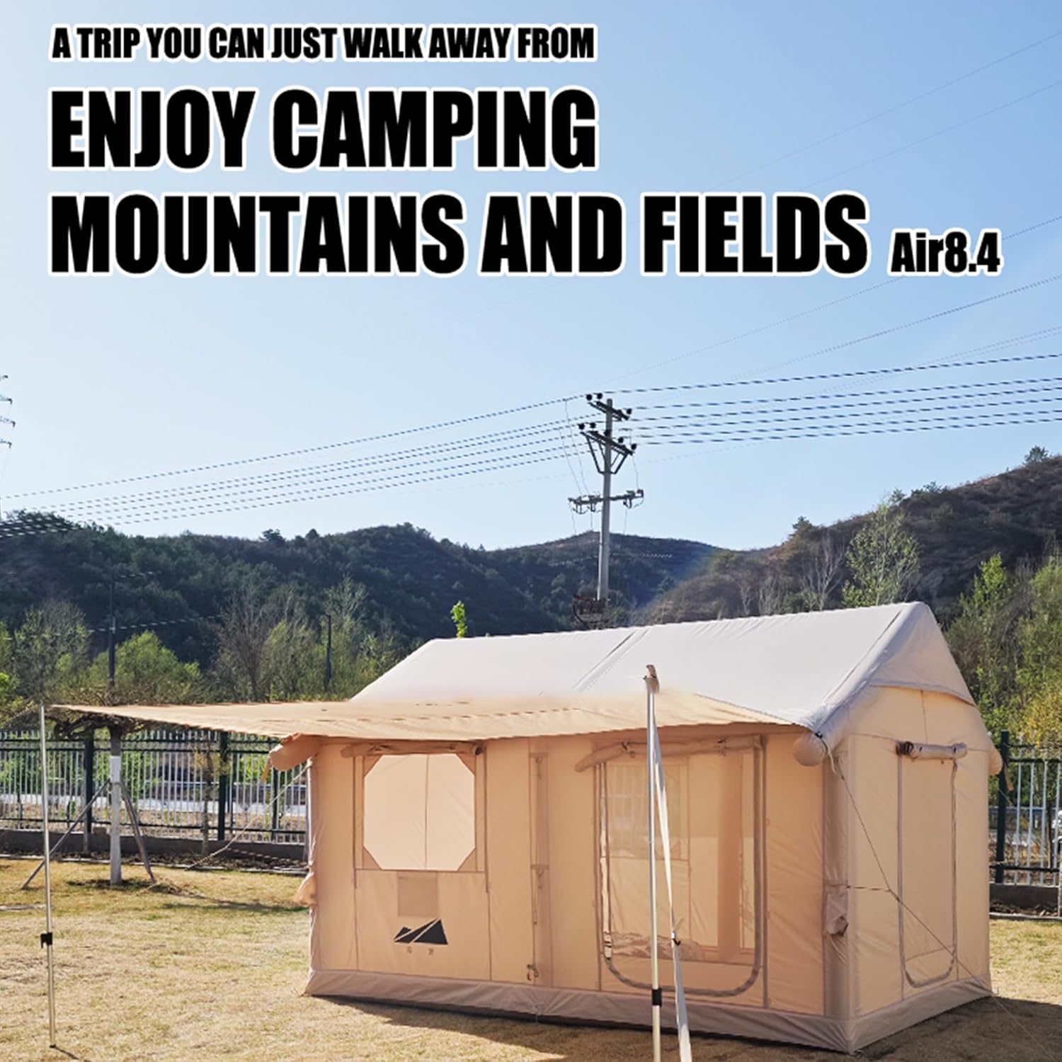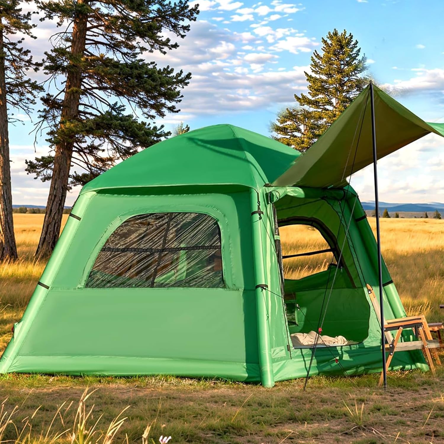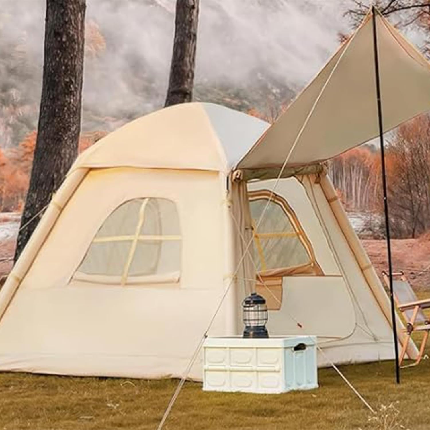 【Ultimate Ventilation & Mosquito-Free Comfort】 Enjoy the breeze without the bugs! Our 4-season Inflatable Camping Tents are designed with large mesh windows and two D-shaped zippered arches to maximize airflow mobility. This strategic ventilation system keeps the interior cool and fresh while effectively preventing insects, ensuring a comfortable sleep during your luxury Glamping Tents outings.