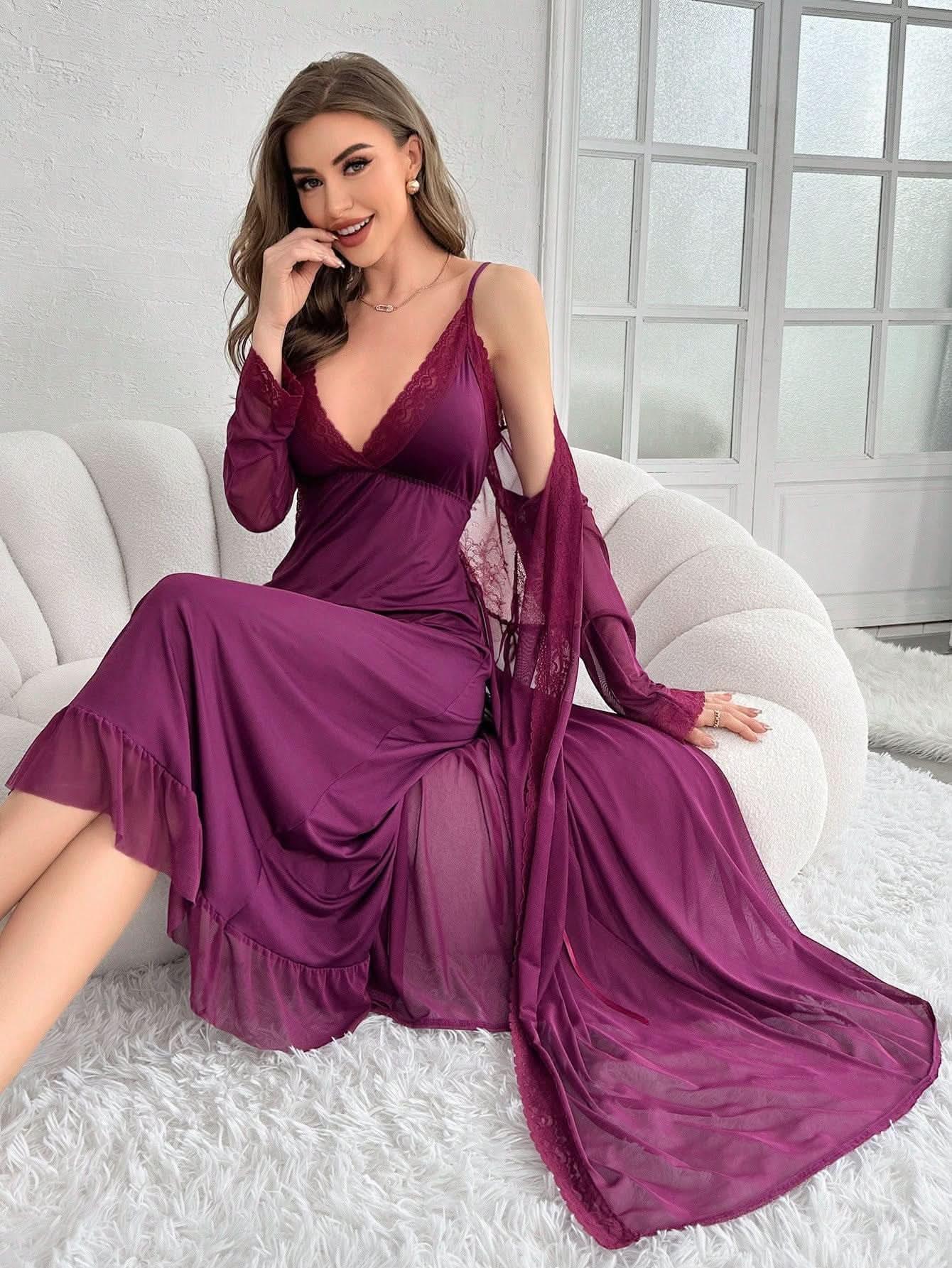 Lace Detail Mesh Robe and Cami Dress Pajama Set Womens Lingerie