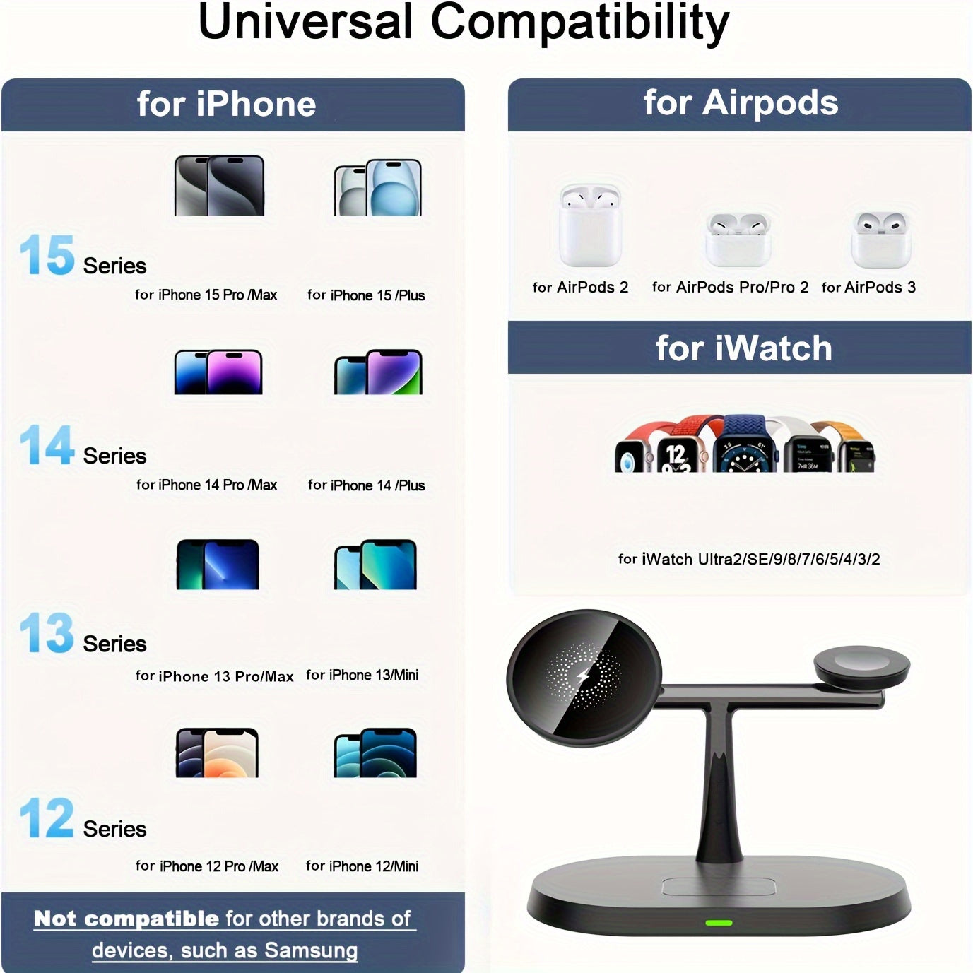 3 In 1Wireless Chargers The new technology delivers seamless magnetic alignment and fast wireless charging in the easiest way for iPhone 15, 15 Pro, 15 Pro Max, 15 Plus, 14, 14 Pro, 14 Pro Max, 14 Plus, 13 13 Pro 13 Pro Max, 13 Mini, 12, 12 Pro Max,12 Mini and Airpods 3/Pro/Pro2 and iWatch Ultra 9 8 7 6 SE 5 4 3 2