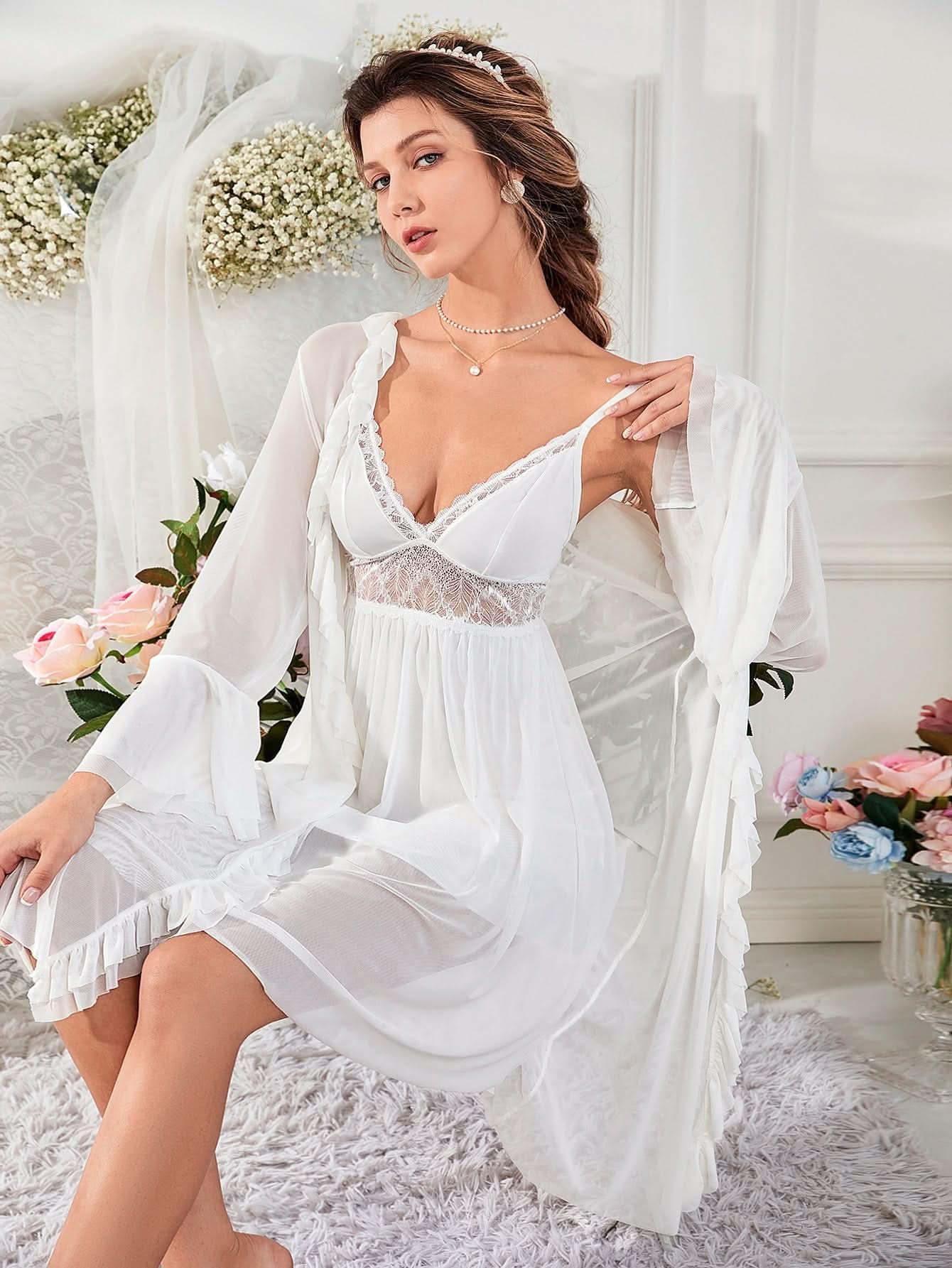 Pajama Set Robe White Dress And A Top Contrasting Lace Embroidery Lingerie