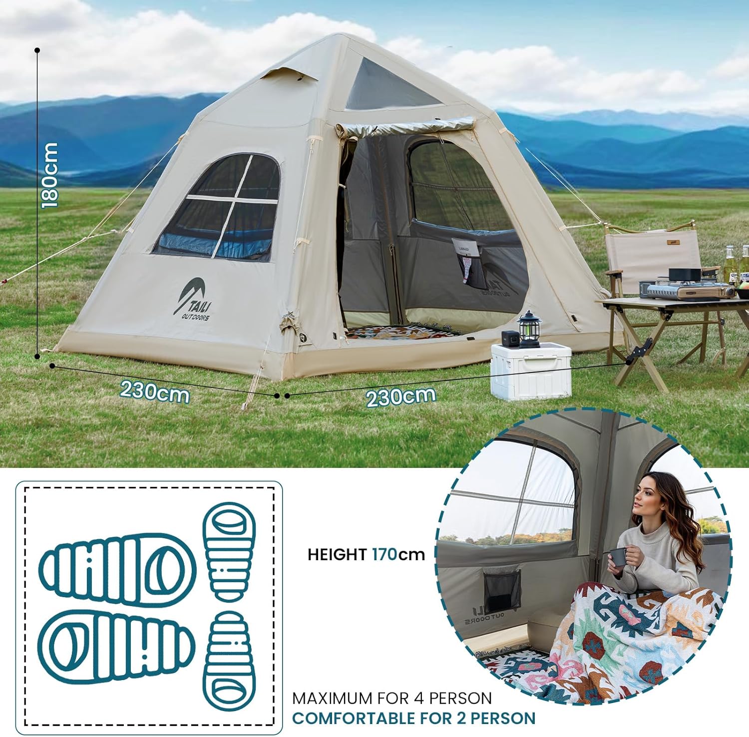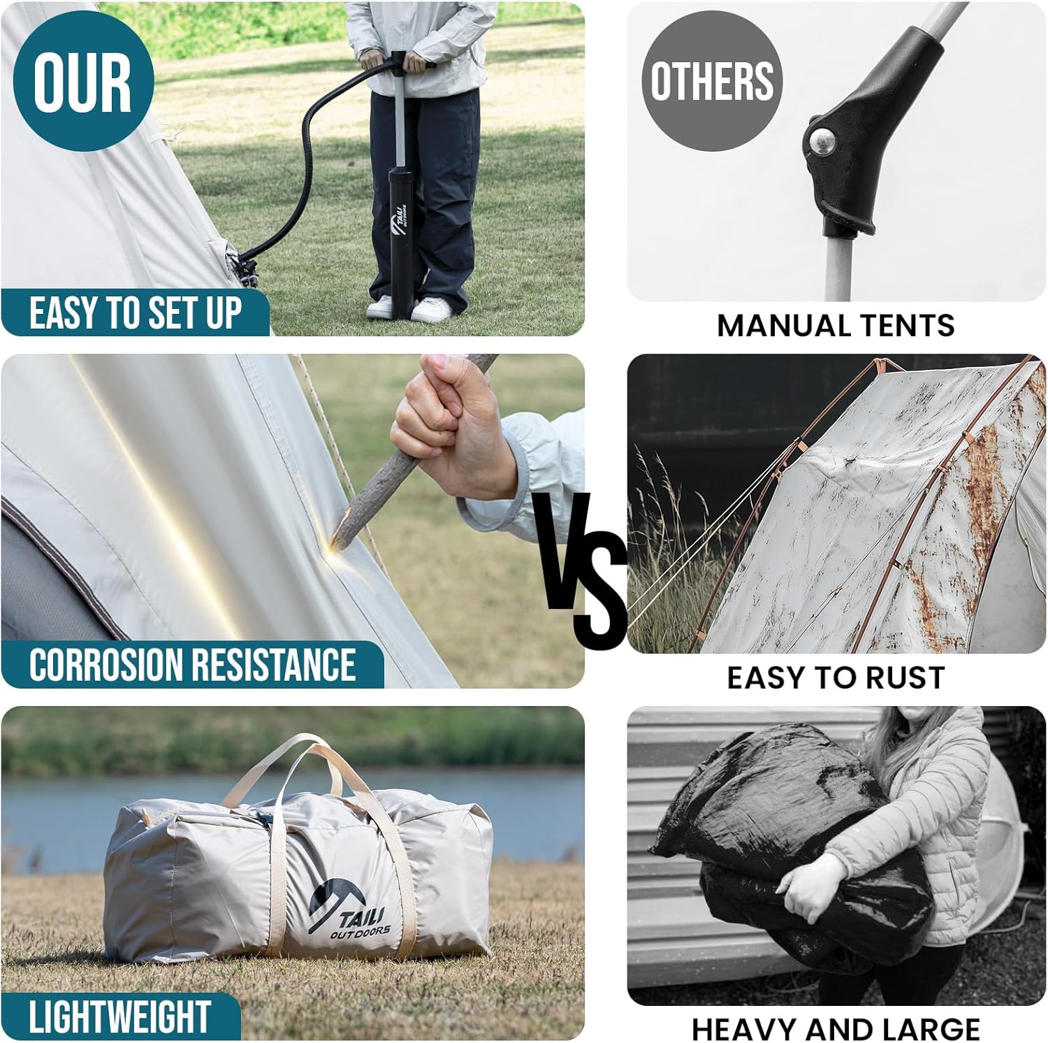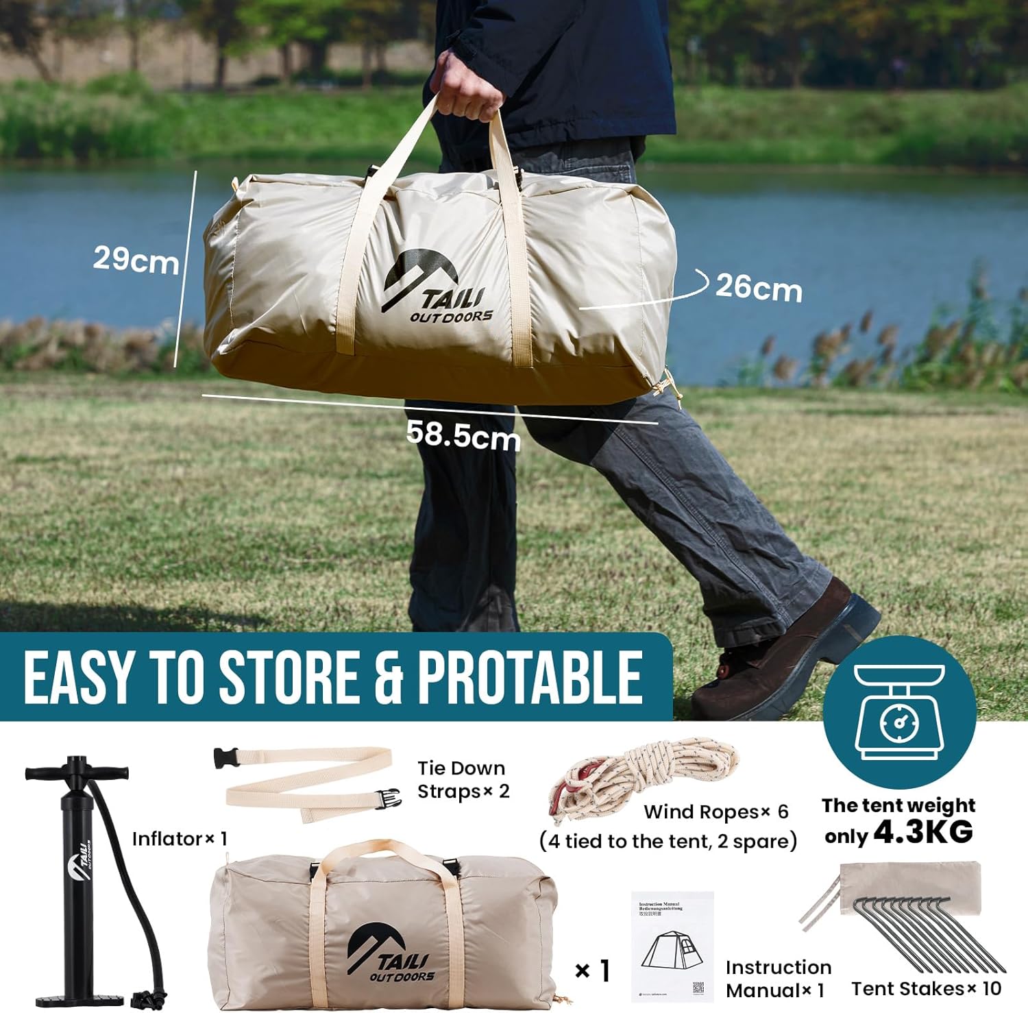 60s Easy Setup: The inflatable tent is equipped with a manual inflatable pump, which can easily set up a tent in just 60 seconds of inflation, and the built-in puncture-resistant and durable air poles make the tent more sturdy and durable. Compared with traditional camping tents, it is easier to set up and quicker to store Large Inflatable Tent: This inflatable tent house measures 70.87 In × 90.55 In × 90.55 In. It comfortably accommodates up to 2 people for sleeping and can seat up to 4 people for activities, making it perfect for enjoying your family camping trips High Quality Material: The tent fly is made by 150d oxford cloth with 2000mm PU coating, tent floor which is 300d oxford cloth with 3000mm PU coating.UPF50+ protection, provides excellent sunshade and UV resistance Excellent Ventilation & Anti-Mosquito: The inflatable tent features a fabric layer for wind and rain protection, and a mesh layer for ventilation and insect prevention. The camping tent's bottom has a threshold height and zippers on both sides. At night, you can fully zip up the doors to ensure a tight seal, effectively keeping insects out of the tent Easy Store & Portable: You can store the tent in a bag which size is 23 In × 11.4 In × 10.2 In, the tent weight 9.5 lbs. Which you will get: 1 x inflable tent, 1 x inflator, 6 x wind ropes, 2 x tie down straps, 10 x tent stakes, 1 x storage bags